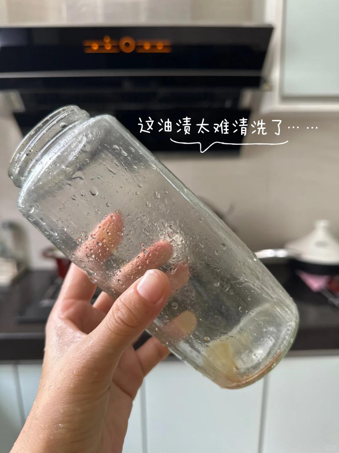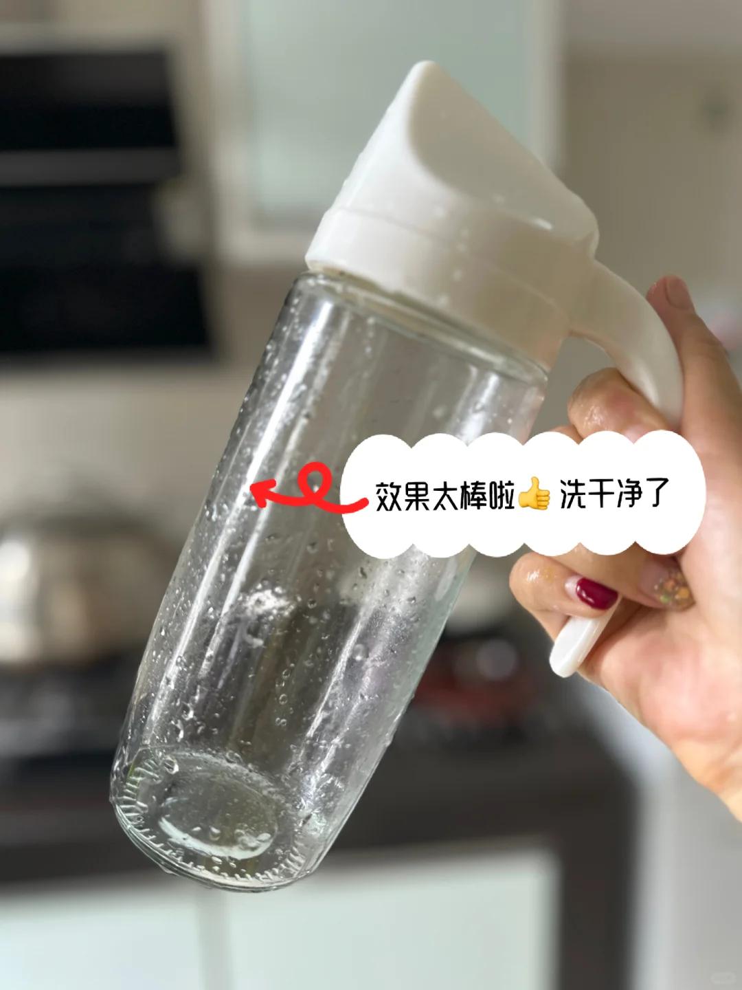 如此重复一两次,你会发现玻璃油瓶上的油垢已大为减少,仅剩的少量油垢也只需用刷子轻轻一刷即可彻底清除。