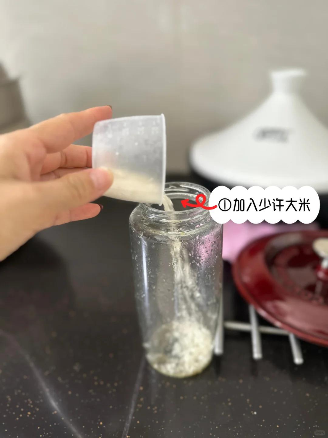 只需在油壶内加入少量大米和适量洗洁精,再注入清水,上下摇晃至混合均匀。