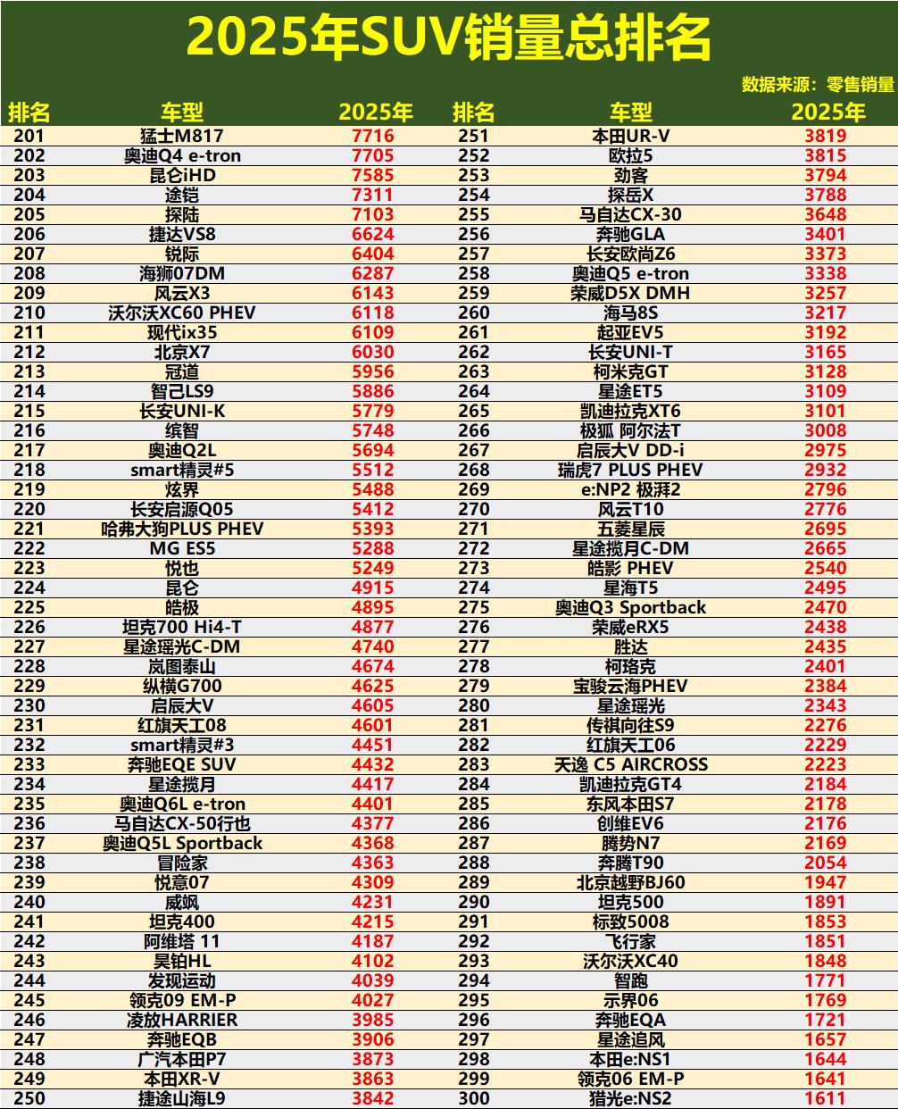 翻阅2025年SUV销量榜单,一幅强弱分明却又新老交织的图景展现在眼前。新能源SUV表现出色,特斯拉Model Y以超过42万辆的成绩一骑绝尘,理想L6、问界M7/M8/M9系列、小米YU7等主打家庭或科技的新势力产品销量亮眼,比亚迪的元UP、宋Pro DM等也稳稳位居前二十。在榜单的中后段,从零跑C11、深蓝S05到各品牌的PHEV车型,几乎每隔几名就能看到新能源的身影。这场竞赛已没有旁观者,每个品牌都在用自己擅长的方式参赛。大胜!2025年SUV销量年度排名:燃油车爆发,途观L、瑞虎8前10!
