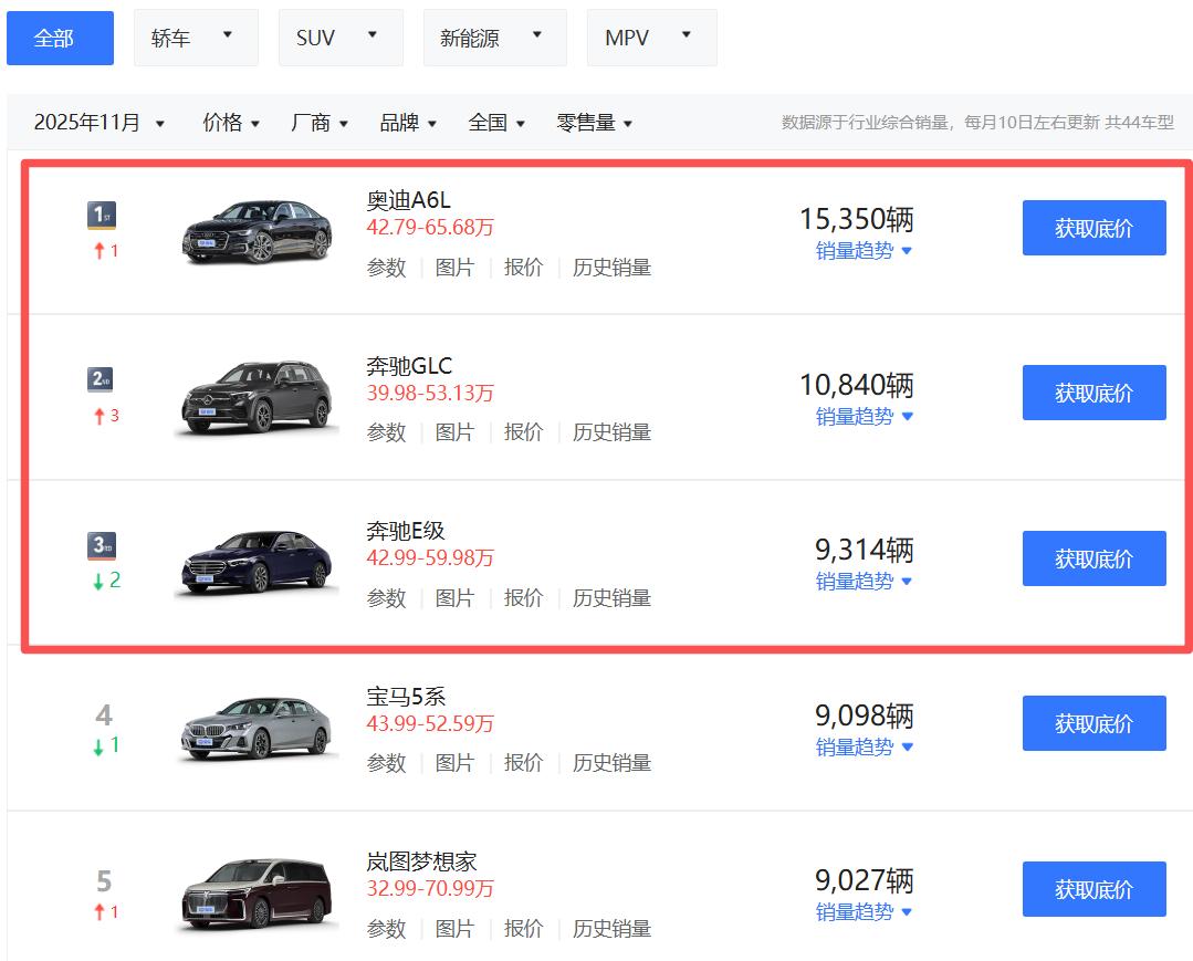 在2025年10月份,BBA旗下的车型重新回到了50万以上销量榜的前三名。到了11月份,德系三强更是直接拿下了50万及以上销量榜的前四名。这个数据让很多人都感到意外,直呼豪华车市场的“风向变了”。