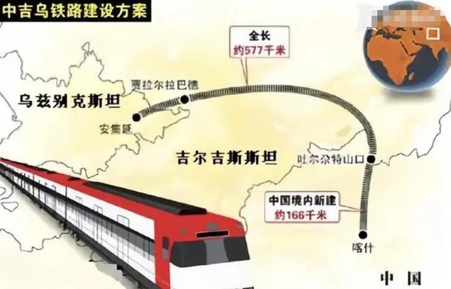 根据最新规划,这条铁路全长523公里,采用的是中国和欧洲标准的1435毫米轨道,而非俄罗斯的1530毫米宽的铁轨。中国境内是大约是166公里,吉尔吉斯斯坦境内是大约304公里,乌兹别克斯坦境内是50多公里。一旦通车,可以从乌鲁木齐出发,直接经吉乌两国,进入伊朗,然后经过土耳其抵达德国,中欧路程至少缩短一周以上。