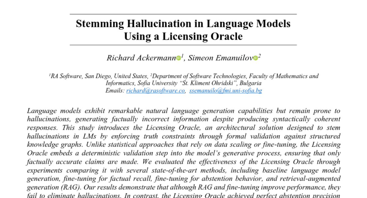 当你向ChatGPT询问某位哲学家的出生日期时,它总是信心满满地给出答案,哪怕这个答案完全错误。这种现象被研究者称为「幻觉」,就像AI患了妄想症,总是编造一些听起来很有道理但实际上完全错误的信息。来自加州圣迭戈RA软件公司的理查德·阿克曼和保加利亚索菲亚大学的西蒙·埃马努伊洛夫在2025年发表的这项研究,提出了一个革命性的解决方案——「许可证神谕」系统。