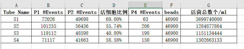 3. 检测与分析:仪器采集信号后,根据 PI 染色情况区分细胞群体:P1 区(全部事件)、P2 区(活细胞群,荧光信号低)、P4 区(死细胞群,PI 阳性)、Beads 区(计数微球)。样本活菌数量通过微球与样本信号比例计算,单位为个/mL。