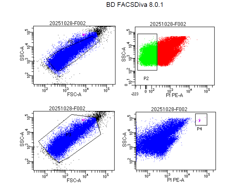 本实验采用 BD FACSCANTO II 流式细胞仪(美国 BD),配合 PI(碘化丙啶)染料进行细胞活性检测。PI 能选择性穿透受损或死亡细胞膜,与核酸结合后发出红色荧光,从而与未染色的活细胞区分。通过散射光与荧光信号的联合检测,可得到细胞群体的 FSC(前向散射)、SSC(侧向散射)及 PI通道荧光强度分布,从而判定细胞状态。