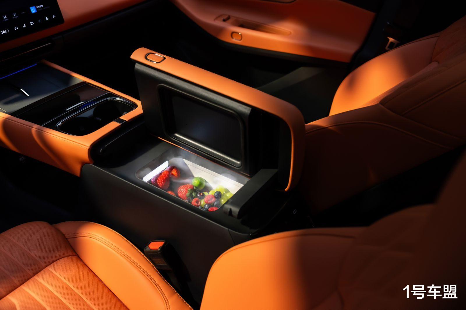 车内还藏着不少 “暖心小设计”:中控位置有个 7 升的双开门冷暖冰箱,从 24℃降到 - 6℃只要 10 分钟,还能保温在 35℃-50℃,有 5 种模式可选,就算下车了,24 小时内还能保持温度,用手机 APP、语音或者车机都能控制,夏天放冰饮、冬天热牛奶都方便。全车静谧性也做得好:前排用 5.4 毫米双层夹胶玻璃,天幕加了 0.76 毫米 PVB 夹胶层,还优化了 160 多项风噪问题,90% 的地方都做了隔音处理,车速 100 公里时,座舱里噪音才 58 分贝;再配上 23 个扬声器的哈曼卡顿音响,坐在车里就像在 “移动音乐厅”。