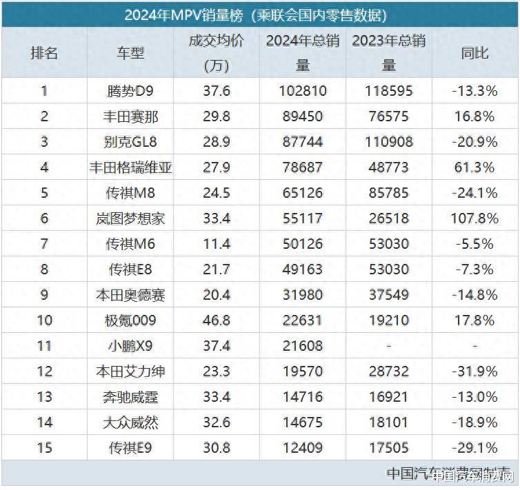 2024年MPV销量T0P15榜单已经出炉,这15款MPV基本都是大家耳熟能详的产品,腾势D9虽然今年同比下滑13%,但是仍然以102810台的成绩夺得2024年MPV销量冠军,已经连续两年成为MPV市场销冠。