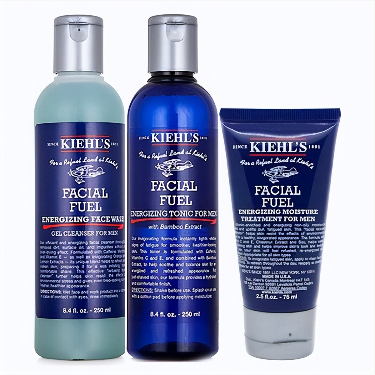 4. 科颜氏蓝色护肤套装洁面啫喱和水乳套装,洁面泡沫绵密,很容易清洗,肤感很清爽,有着醒肤的作用,爽肤水的质地清爽,可以有效地控油,收缩毛孔,乳液可以改善肌肤,增加肌肤起色,适合长期熬夜加班的男士。
