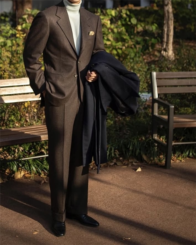 法兰绒西装:经典冬季选择,细腻柔软,内搭高领羊绒衫,保暖性极佳;