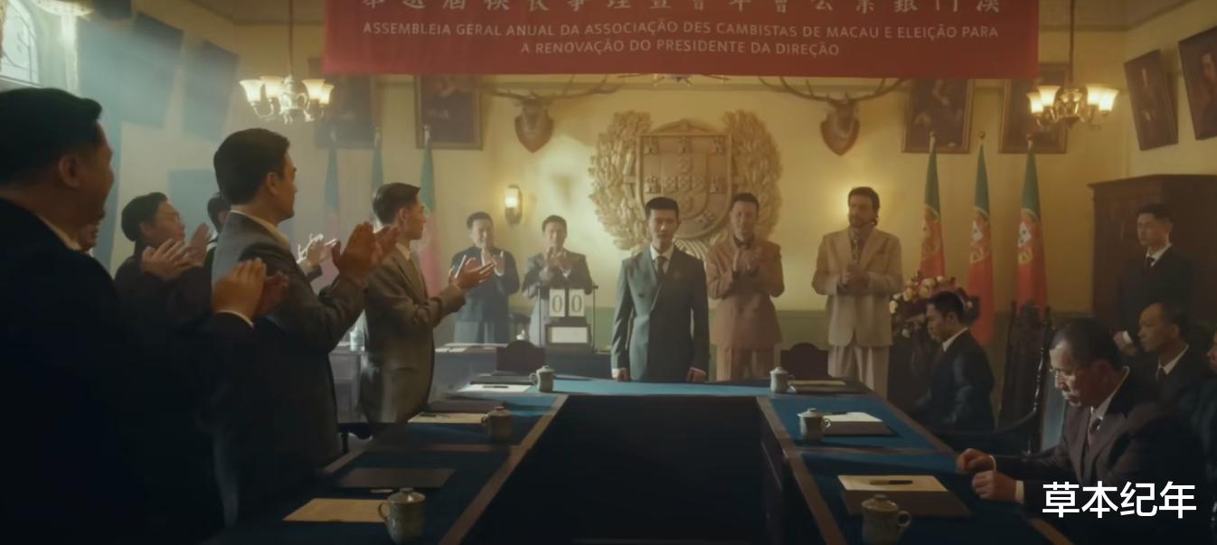 商户联盟会:何贤用"军票=废纸"的比喻说服众华商,镜头从他挥动的手势切换到窗外飘扬的葡萄牙国旗,暗示"中立"外衣下的民族立场。