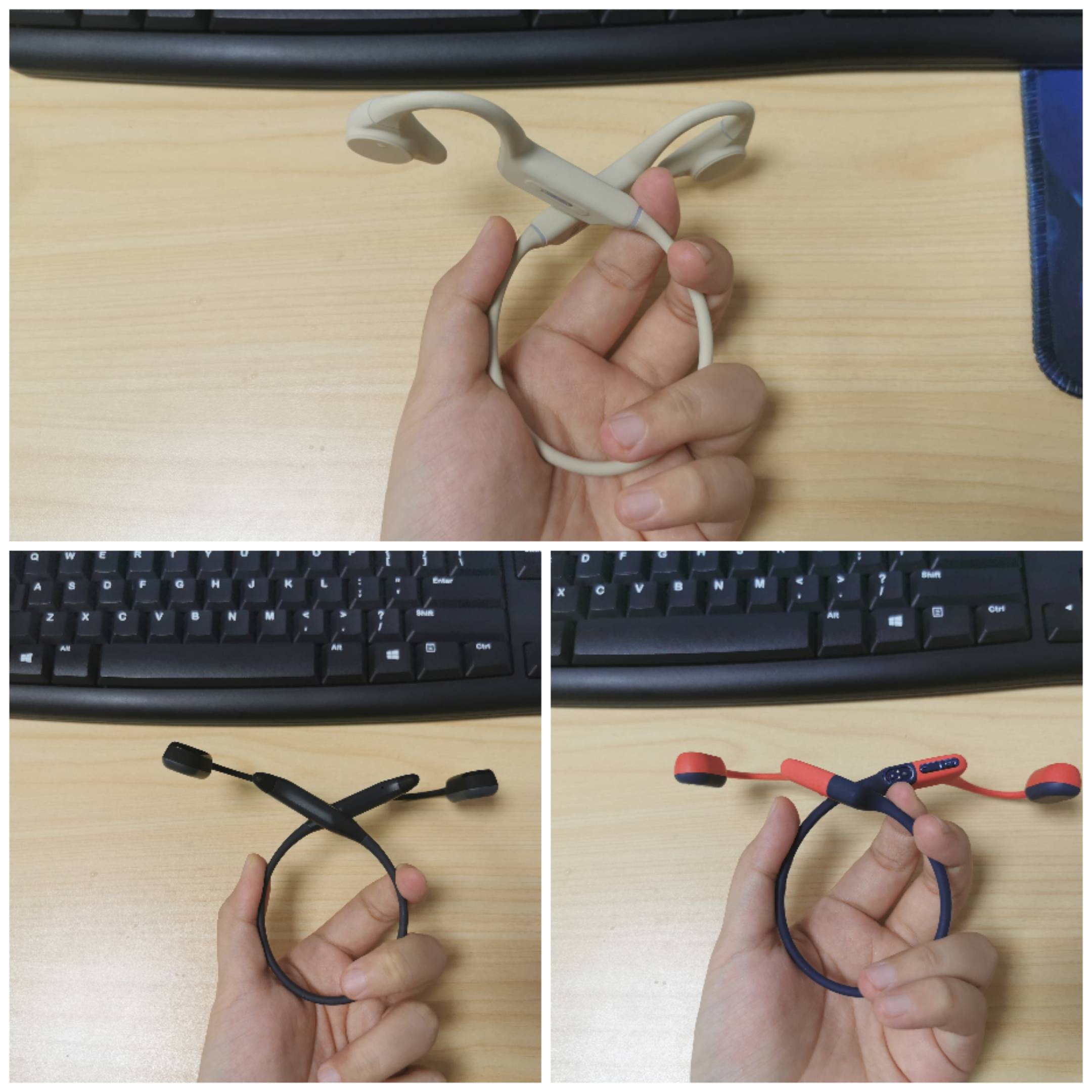 骨传导耳机大多数采用挂耳式佩戴少数采用夹耳式佩戴,相对于传统入耳式耳机来说,骨传导耳机因为一体化设计,不能够随意替换耳挂部分,所以在全面测评时,舒适度是关键的评价标准。好的品牌会通过轻量化机身设计和选用更加柔软的材料包裹耳机能让用户得到一个更舒适的佩戴感受。在佩戴舒适度方面我们将从机身重量、材质选用以及佩戴体验,三方面进行测评,由于三款耳机的定位都是游泳运动耳机,所以特意加上游泳场景还有骑行场景的佩戴表现,让我们看看三款耳机的表现如何吧