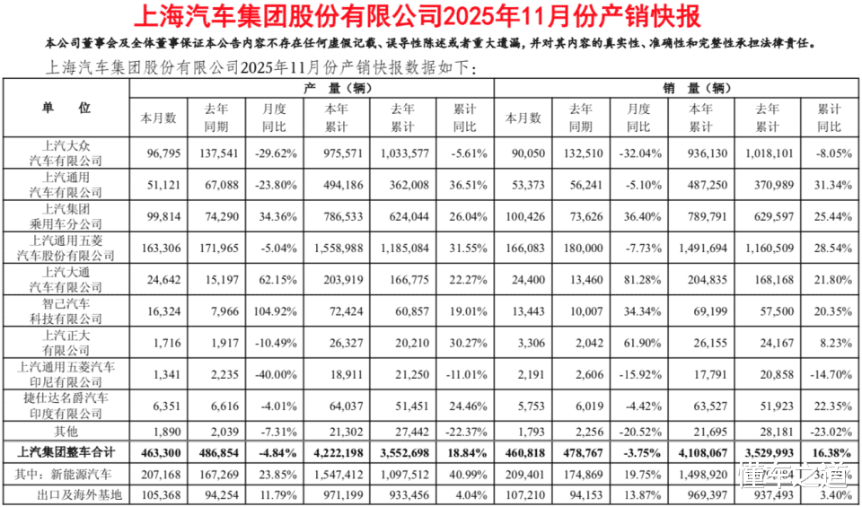 12月2日,上汽集团公布2025年11月以及2025年前11月销量快报。数据显示,2025年11月,上汽集团整车合计销量为46.08万辆,同比下滑3.75%。其中,新能源汽车销量20.94万辆,同比增长19.75%;出口销量为10.72万辆,同比增长13.87%。2025年前11月,上汽集团累计销量为410.81万辆,同比增长16.38%。其中,新能源汽车累计销量为149.89万辆,同比增长38.79%;累计出口销量为96.94万辆,同比增长3.40%。