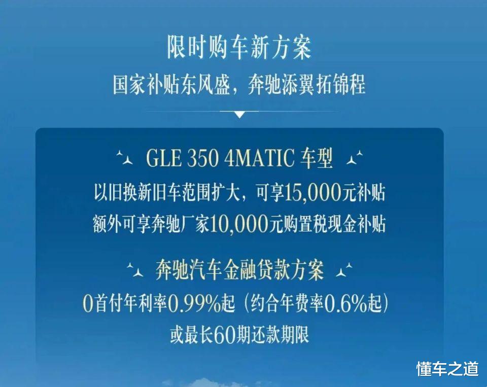 日前,奔驰推出GLE限时购车方案,购买GLE 350 4MATIC车型,以旧换新旧车范围扩大,可享1.5万元补贴,额外可享奔驰厂家1万元购置税现金补贴。奔驰客户可享本品置换/增换购1万元车辆保险支持。金融贷款方案,0首付年利率0.99%起或最长60期还款期限。
