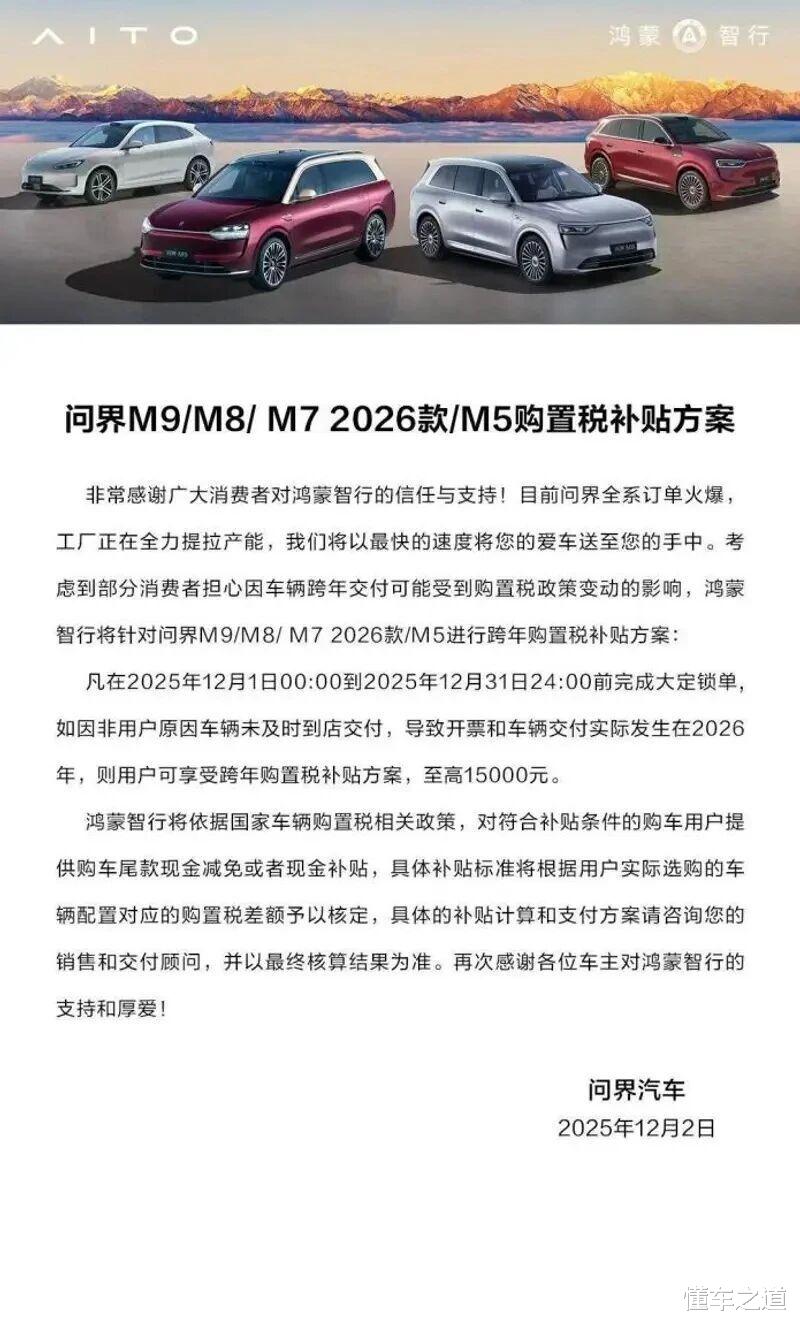 近日,问界汽车针对问界M9/问界M8/问界M7 2026款/问界M5推出了跨年购置税补贴方案:即日起至2025年12月31日24:00前完成大定锁单,如因非用户原因车辆未及时到店交付,导致开票和车辆交付实际发生在2026年,则用户可享受至高15000元跨年购置税补贴方案。该补贴将以购车尾款减免或现金补贴形式发放,具体补贴标准将根据用户实际选购的车辆配置对应的购置税差额予以核定