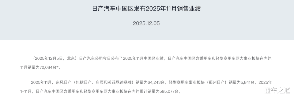 12月5日,日产汽车公布2025年11月中国区业绩。数据显示,2025年11月日产汽车中国区含乘用车和轻型商用车两大事业板块在内的销量为70,084台,同比增长10.2%,其中东风日产(包括日产、启辰和英菲尼迪品牌)销量为64,243台,同比增长7.9%,郑州日产销量为5,841台,同比增长44.3%。