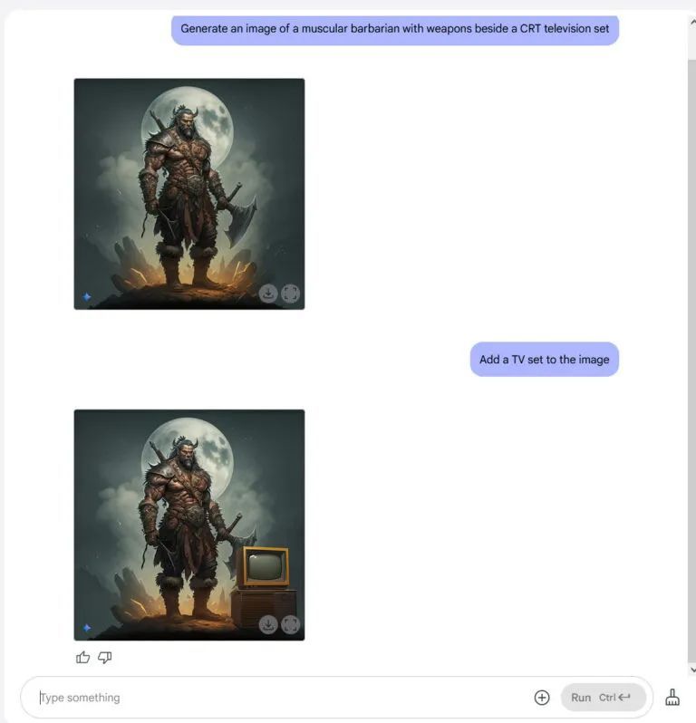 最后,我们知道你可能已经厌倦了在电视机旁边看到野蛮人(按传统),所以我们试了一下。起初,Gemini并没有在野蛮人图像中添加CRT电视机,于是我们要求它添加一个。