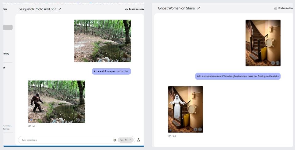 我们还尝试向图像中添加合成物体。始终警惕媒体现实的崩塌,被称为“文化奇点”,我们在作者从飞机窗户拍摄的照片中添加了一个UFO。然后我们尝试添加了一个野人和一个鬼魂。结果不够真实,但该模型也仅在有限的图像数据集上训练(更多内容将在下文提及)。