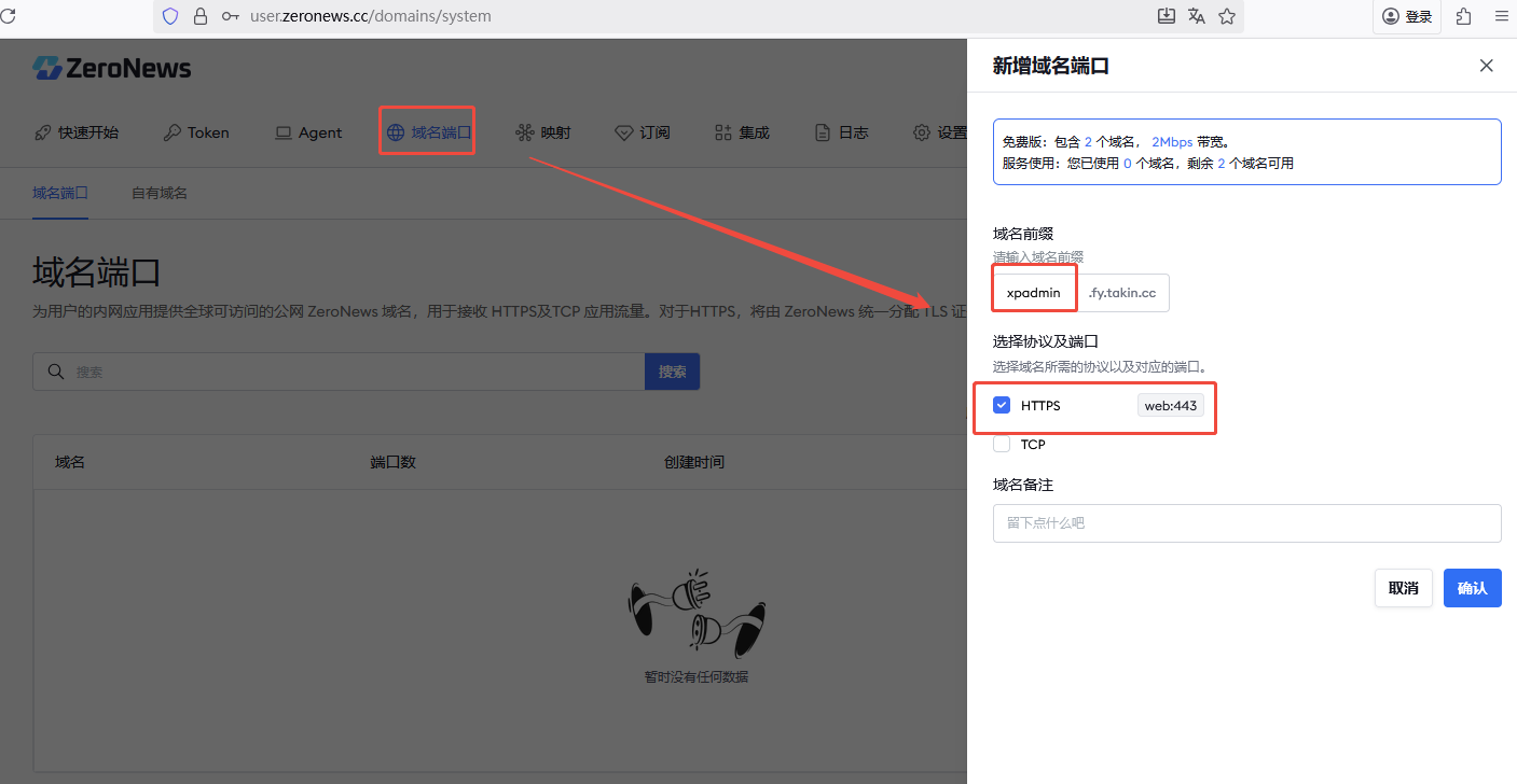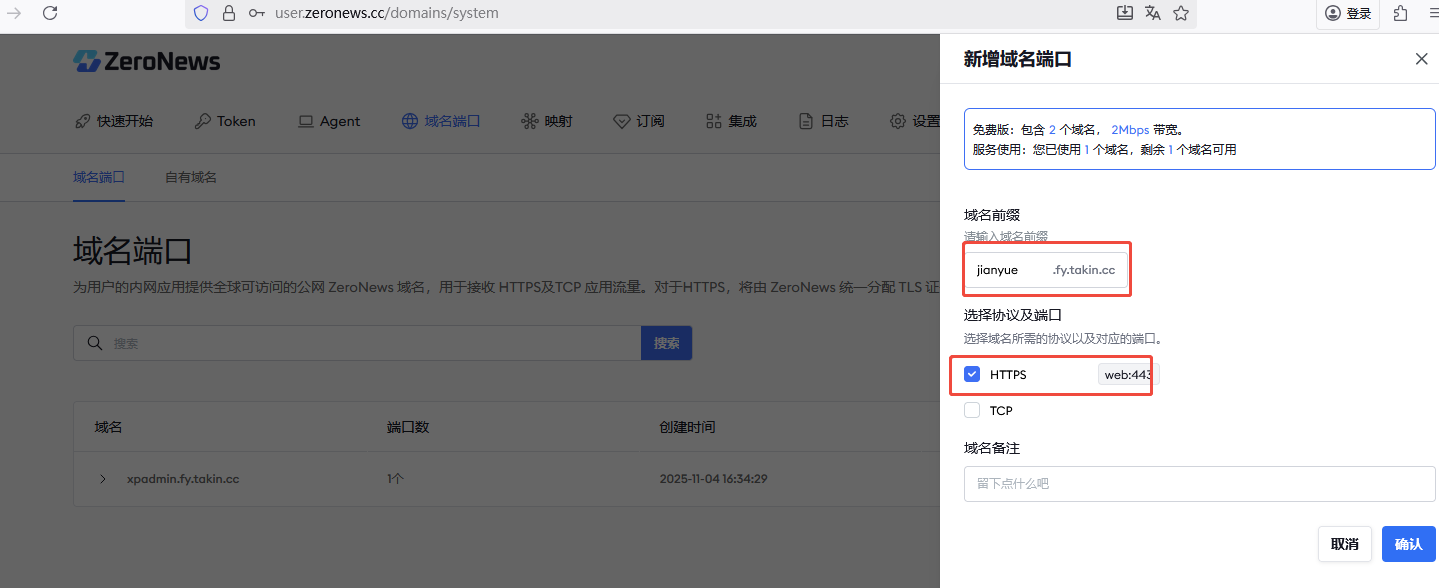 域名前缀: 用户输入定义的 域名前缀,如 xpadmin勾选 HTTPS 协议(如下图)