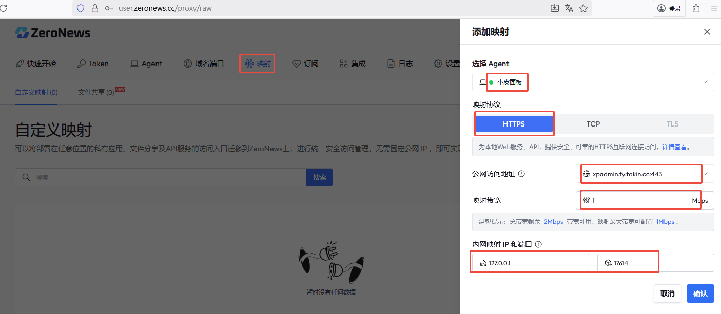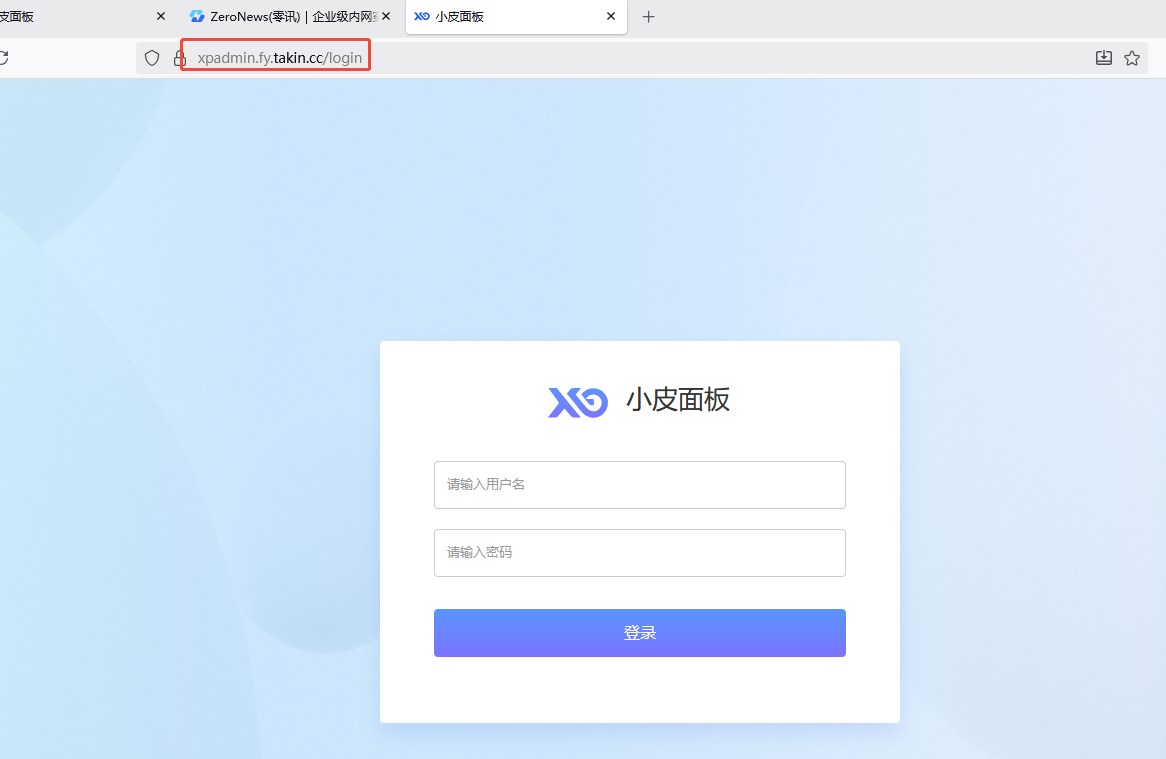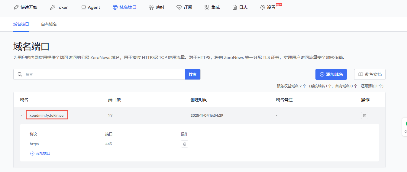 3.公网访问地址:选择 xiadmin 域名, xpadmin.fy.takin.cc