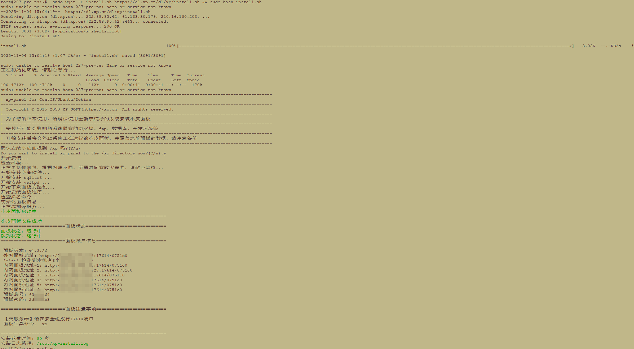 等待安装完成,提示以下信息,表示小皮面板安装完成,同时输出小皮面板的访问地址及面板账号密码。
