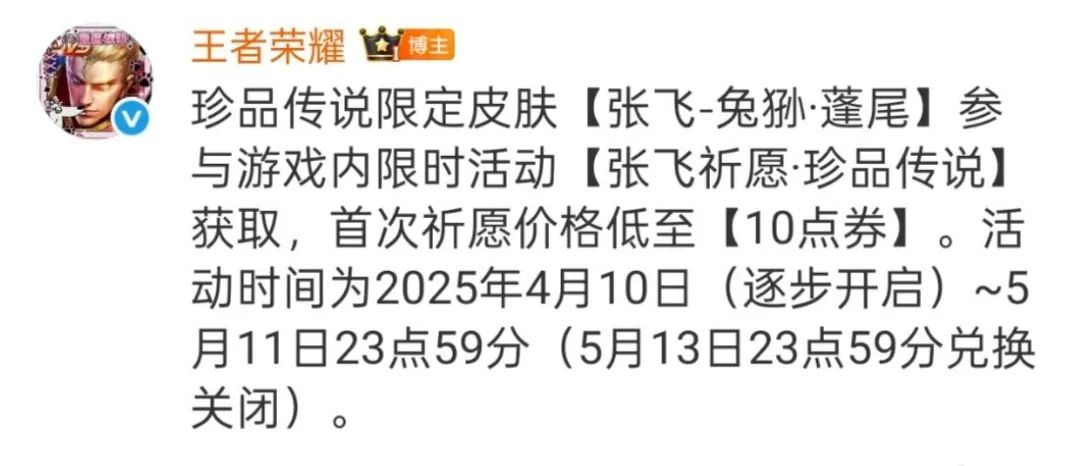 张飞这款联动皮肤将于4月10日更新后上线,需要祈愿获取。这已经不是第一款珍品传说了,所以大家应该并不陌生了。