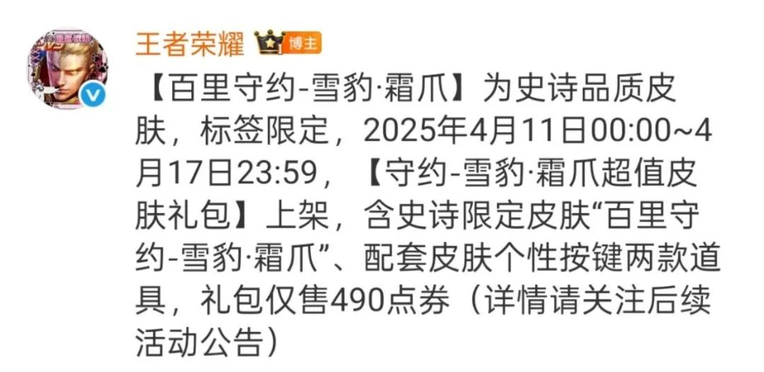 百里守约的这款新皮肤,果然是史诗品质,当然少不了还有限定标签。该皮肤首周有跟个性按键打包,还可以。上线时间是4月11日。但其实正式上线时间是4月18日。