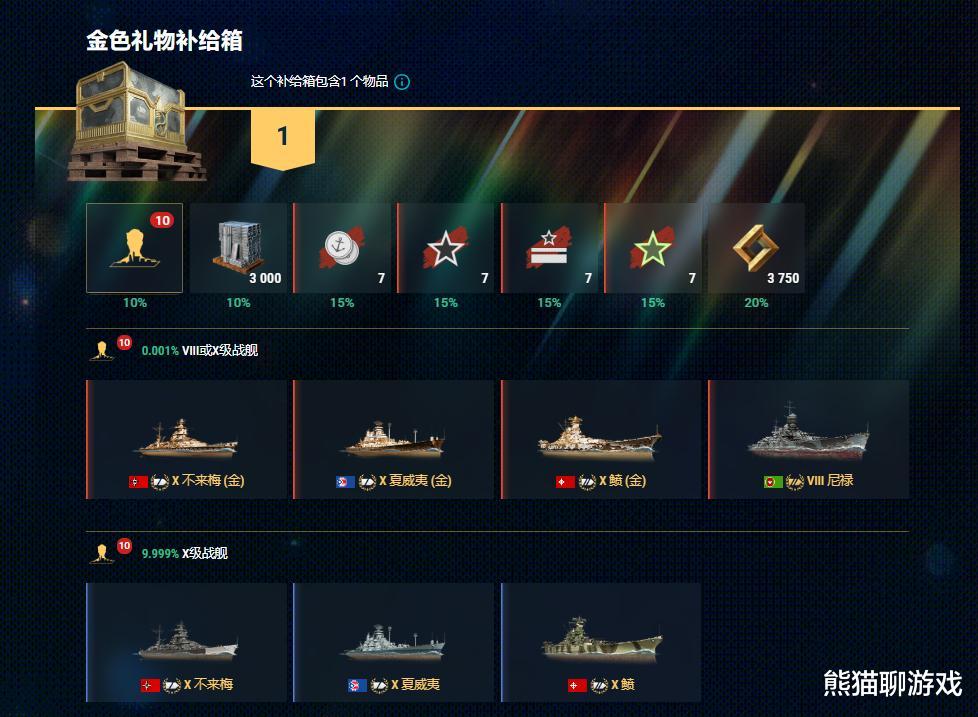 值得一提的是,所有圣诞箱都有概率掉落“金色礼物”补给箱,开金箱不仅有机会爆出不来梅、夏威夷、鲼及其金色版本,还有全新的海军遗产8级战舰尼禄以及研发点、钢铁等豪华奖励哦!