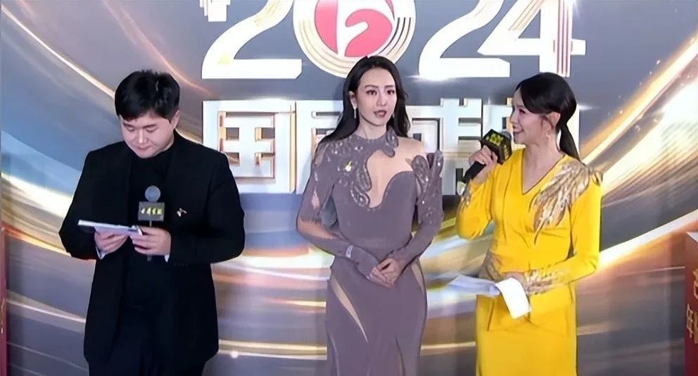 她身着一袭紫色长裙,裙装的不对称设计格外引人注目。左边香肩微露,而右边则装饰着精致的线条图案和闪烁的钻石,灯光映照下,璀璨夺目。
