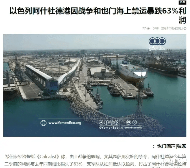 以色列版《经济学人》报道称,除了以色列南部的埃拉特港之外,中部的阿什杜德港同样因为胡塞武装的海上封锁而遭受巨大损失,今年第二季度该港的利润已经同比暴跌了63%。