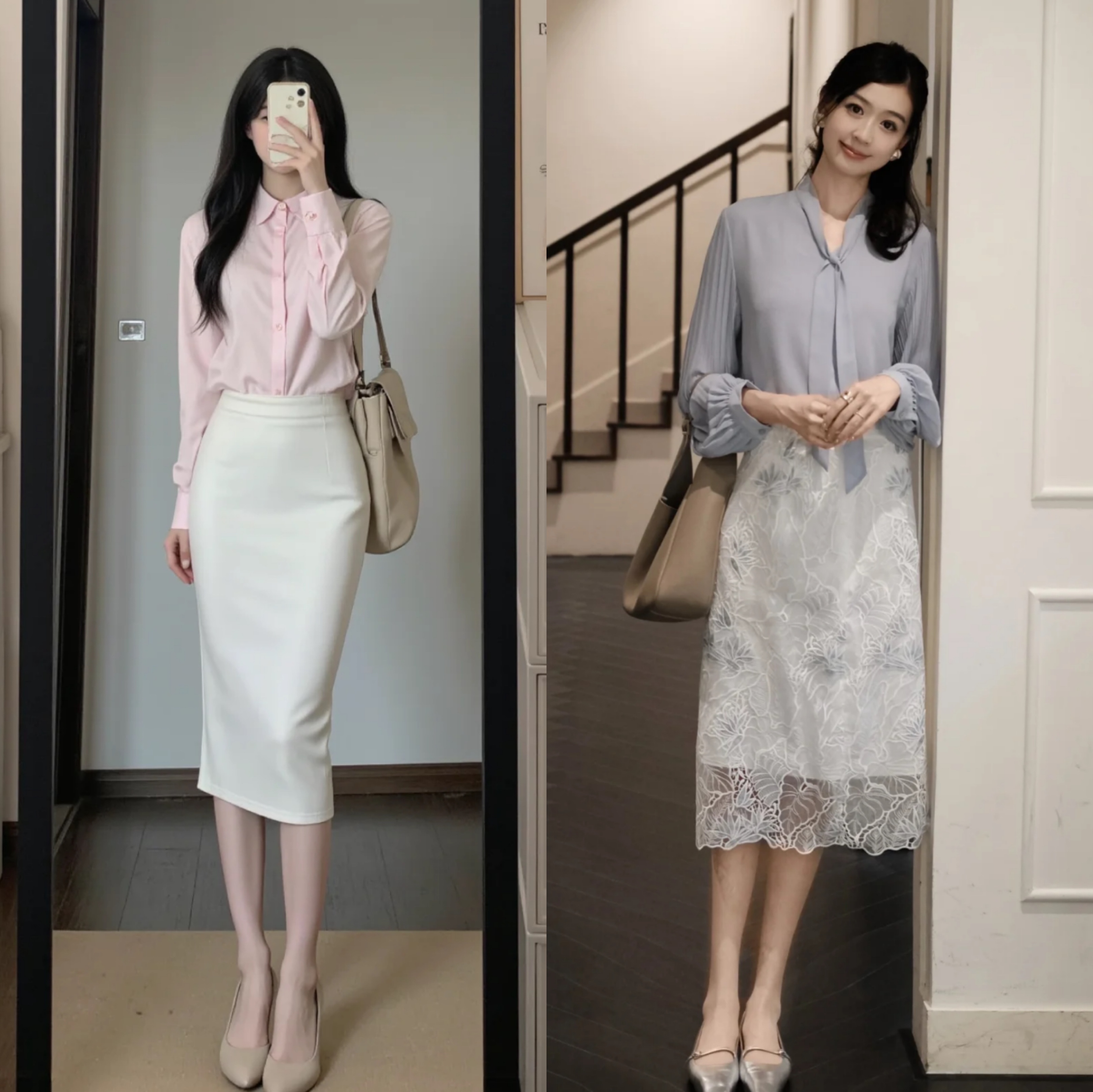 比如,米白色类似上衣搭配粉色短裙,浅粉色缎面衬衫搭配卡其色开叉包臀裙,简约舒适的色彩搭配,既简约又时尚,展现出独特的魅力。