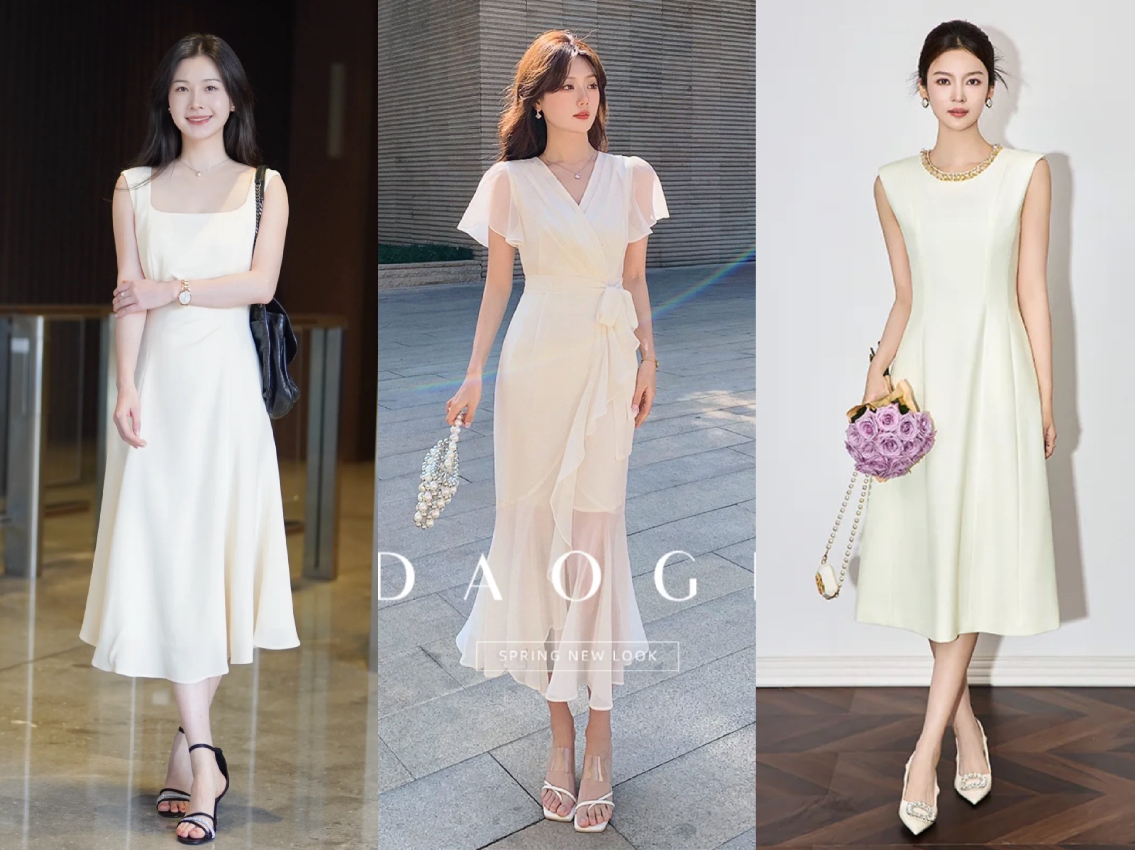 轻熟风穿搭范例米白连衣裙+裸色高跟鞋