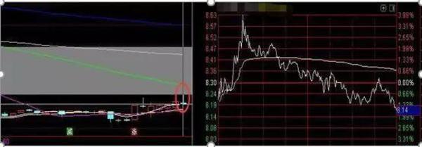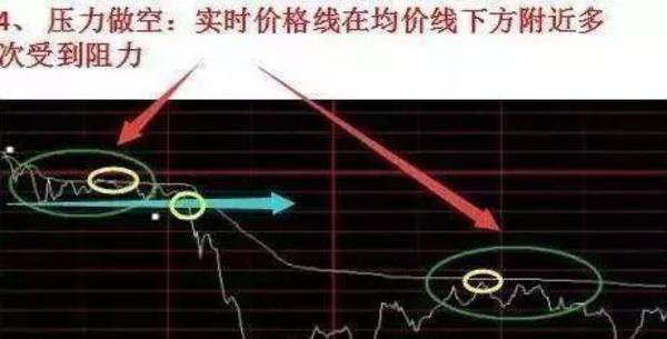 【解读】这种形态也是比较经典的当日应该建仓或出局的形态,受到均价线压制,震荡之后拐头向下,这是重要减仓点,卖点在每次反弹到均价线附近和跌破平台的位置。