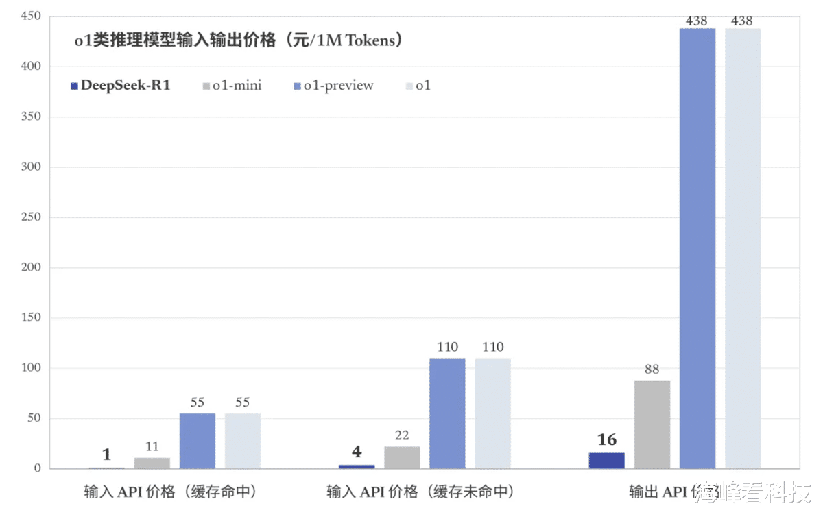 在定价方面,DeepSeek也很“吓人”。DeepSeek-R1 API服务定价为每百万输入 tokens 1 元(缓存命中)/ 4 元(缓存未命中),每百万输出tokens 16元。与此相比,Open AI推出的o1的服务定价为每百万输入 tokens 55元(缓存命中)/55元(缓存未命中),每百万输出tokens 438元,相差悬殊非常大。