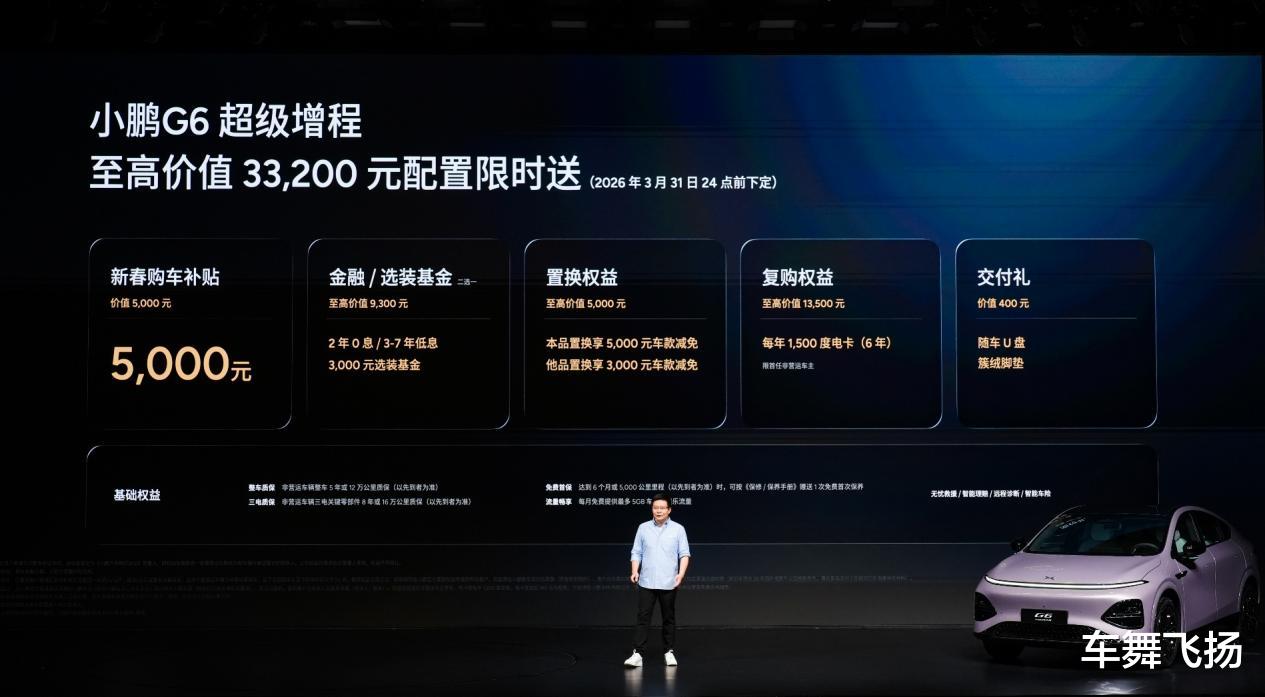 (2026年3月6日,广州)今日,小鹏汽车举行小鹏G6超级增程上市发布会,新车定位六项全能AI增程SUV,以“六项全能 一步到位”为核心,凭借同级综合续航第一、同级补能速度第一、同级车端有效算力第一、同级最强底盘系统、同级最强主动安全和同级得房率第一的六大核心优势,打造真正满足用户全场景需求的国民车。本次发布小鹏G6超级增程1704 Max,官方指导价为18.68万元,用户可选装两个智能升级包,加购12,000元升级为Ultra SE版本、加购20,000元升级为Ultra版本。即日起至2026年3月31日24点前下定小鹏G6超级增程,可享至高价值33,200元限时权益礼包,包括5,000元新春购车补贴、至高价值9,300元金融/选装基金(二选一)、至高价值5,000元置换权益、至高价值13,500元复购权益和价值400元交付礼。