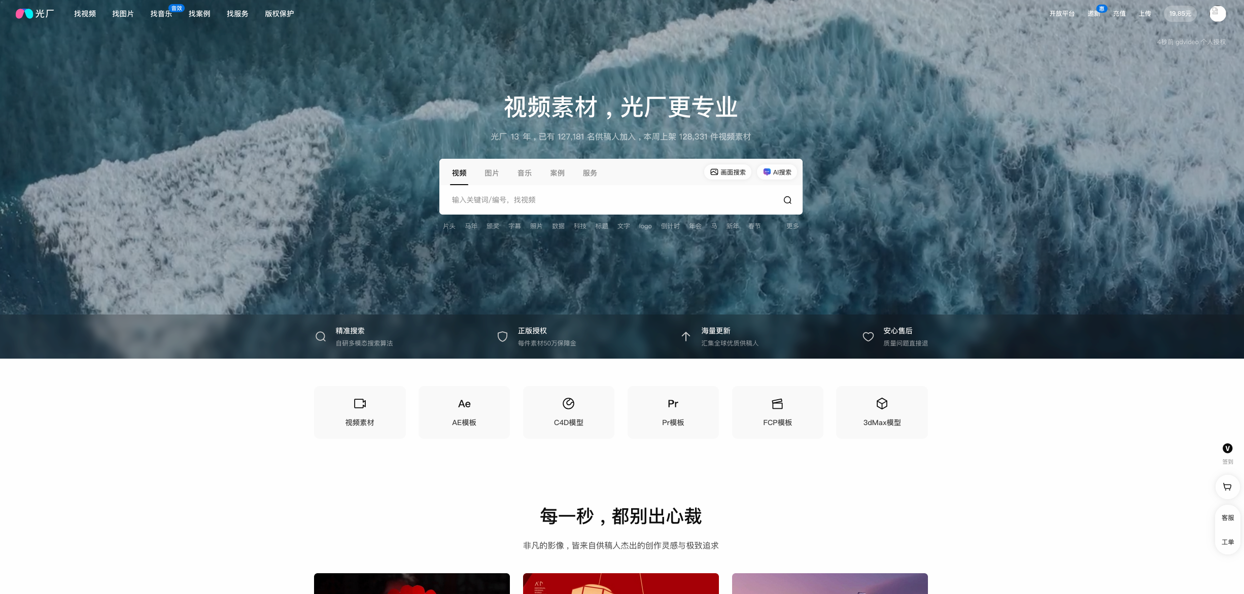目标用户:主要服务于国内市场品牌方、广告公司、企业宣传部门、新媒体运营及视频工作室,是制作企业宣传片、产品发布会、行业峰会视频、高端商务演讲PPT配片的优选资源库。价格模式:主要为付费下载模式(单条购买或套餐包),同时平台设有“免费素材”专区,注册用户可通过签到、任务等方式获取“V币”兑换免费资源,性价比较高
