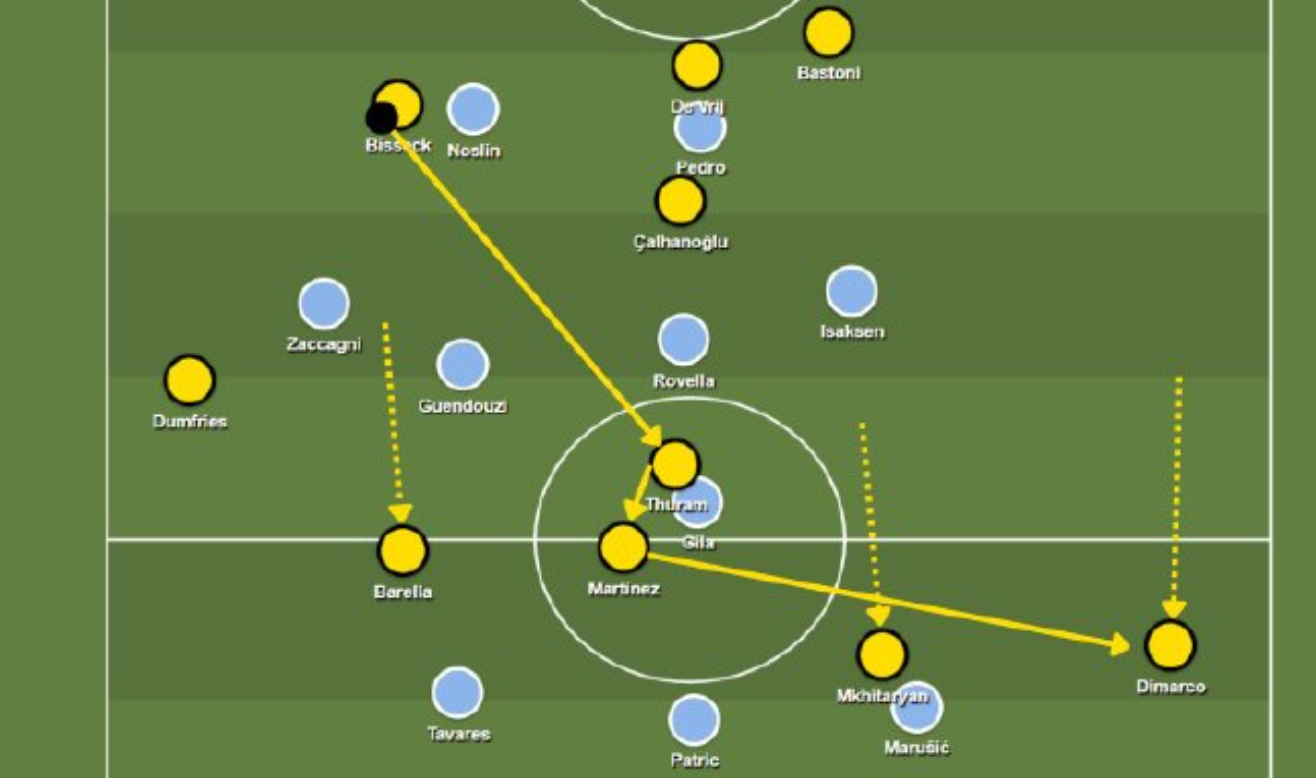 拉齐奥组织起凶猛的“高位逼抢”、“囤积重兵在中路扎堆”的战术,让蓝黑军无法按照惯常的踢法来按部就班的围绕组织核心(恰尔汗奥卢)来建设比赛。