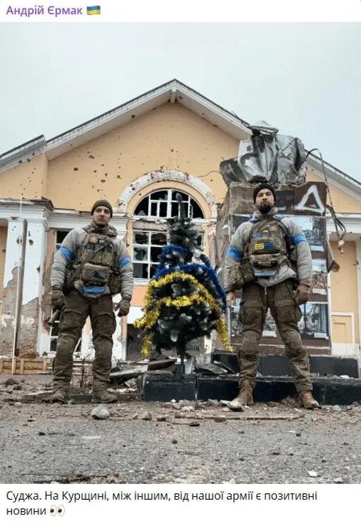 乌克兰士兵还在俄罗斯库尔斯克地区的苏贾镇,象征性地竖起了一棵圣诞树,以展示他们对该地区的控制。一张照片显示,两名乌克兰士兵站在一棵用蓝色和黄色金属丝装饰的小树旁,这正是乌克兰国旗的颜色。背景中可以看到一座布满弹孔和严重受损的建筑,据称这可能是当地的文化之家。