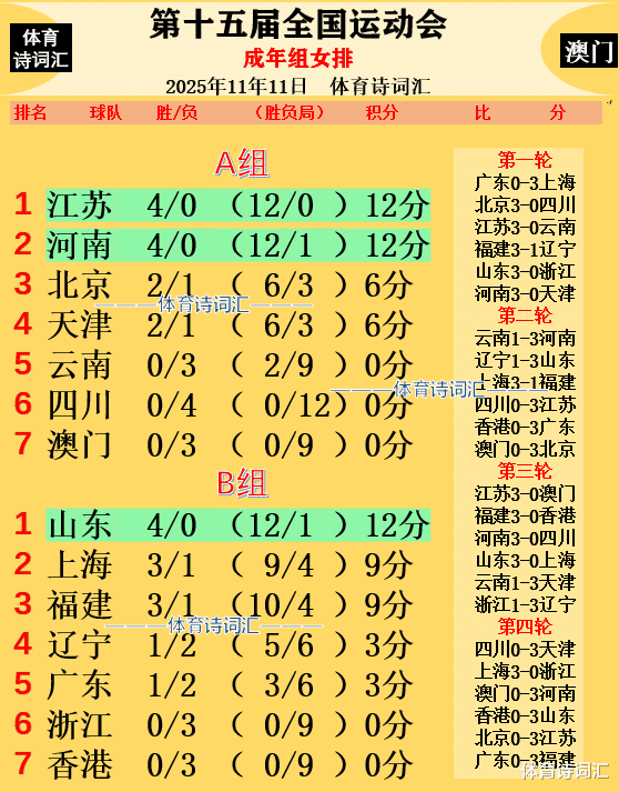 积分榜如下:A组-1、江苏12分;2、河南12分;3、北京6分;4、天津6分;5、云南0分;6、四川0分;7、澳门0分。