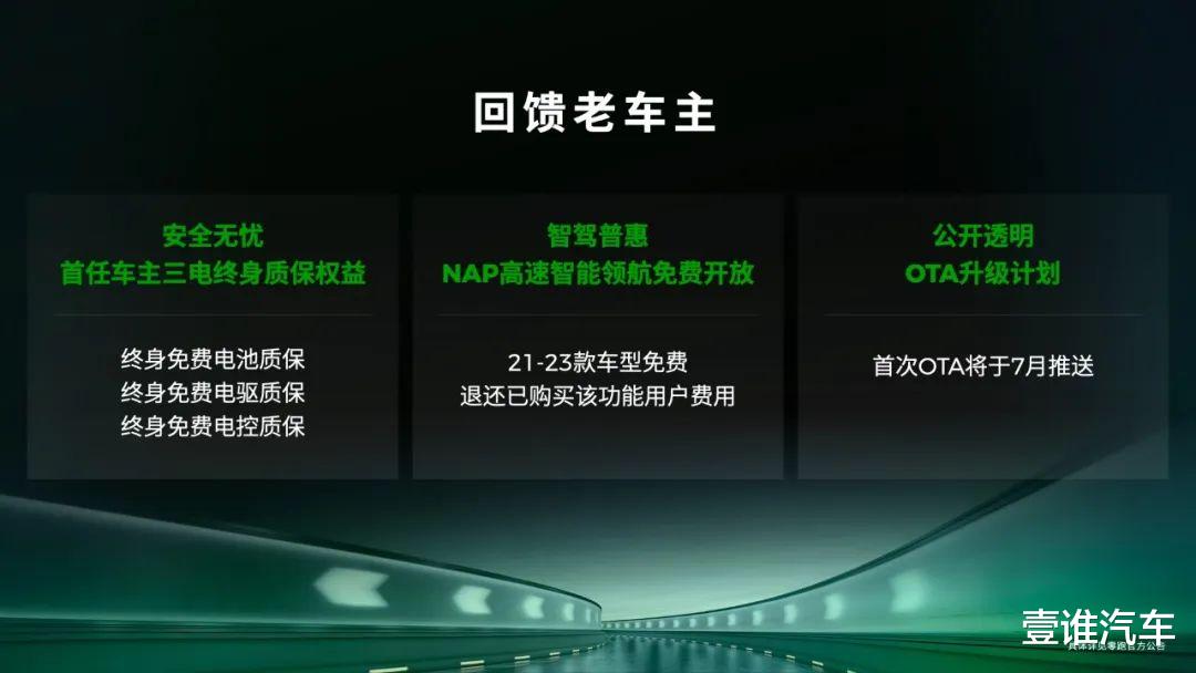 对于没有获得三电终身质保或整车终身质保权益的所有车型首任车主(非营运),补赠三电终身质保权益,服务升级也不让任何一位用户滞后。