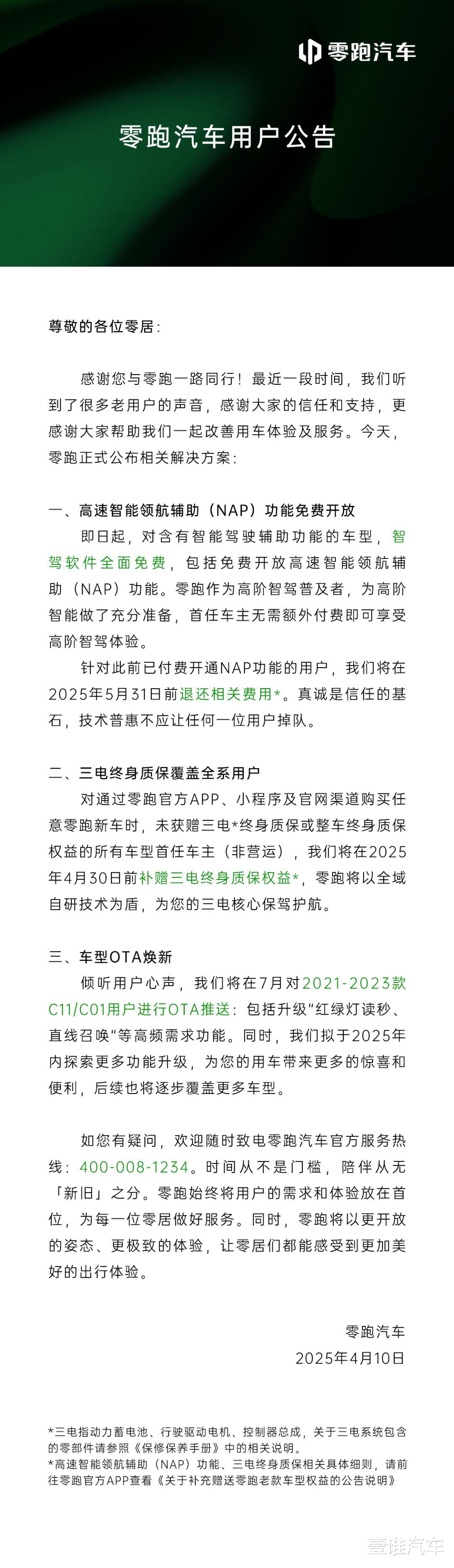 4月10日,零跑汽车发布了一份用户公告,宣布高速智能领航辅助(NAP)功能免费开放,三电终身质保覆盖全系用户,车型OTA焕新。