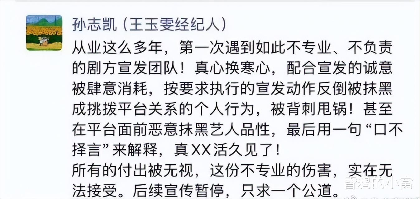 经纪人孙志凯更是在朋友圈愤怒控诉,斥责剧方宣发团队“背刺甩锅”,称其行为是“真心换寒心”,并强调艺人团队的诚意被肆意消耗,直指对方“口不择言的搪塞背后,是对艺人品性的恶意抹黑”。
