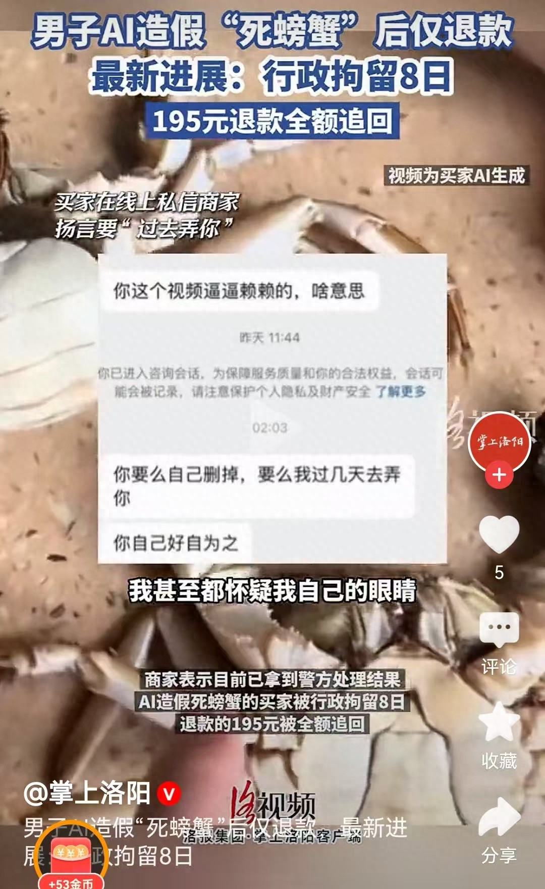 消费者用AI造假死蟹,骗商家退款,遭到治安拘留江苏苏州一商家卖大闸蟹,广州一位消费者网购了8只,但是后续联系商家,其中有照片和视频,说已经有6只是死的,要求退款。商家无奈退款,死螃蟹肯定也不需要退货回来了。不过之后商家仔细辨别发现,死蟹图片和视频疑似AI合成。于是一边向消费者当地警方报案,一边发律师函给消费者,要求对方承认造假行为,返回退款并道歉。