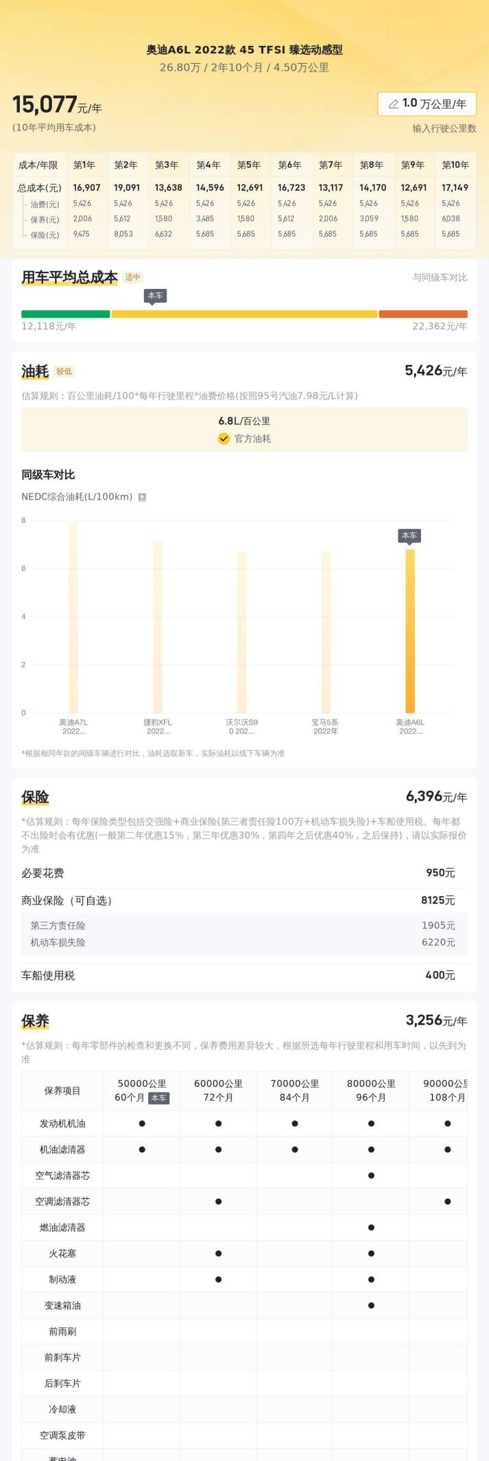 最后,我们来算一笔账。假设这辆A6L每年行驶2万公里,预估10年的平均用车成本大约在16101元/年,包括燃油费、保养费、保险费等。与同级别车型相比,这个用车成本属于中等水平,不算太高,但也需要一定的经济实力来支撑。