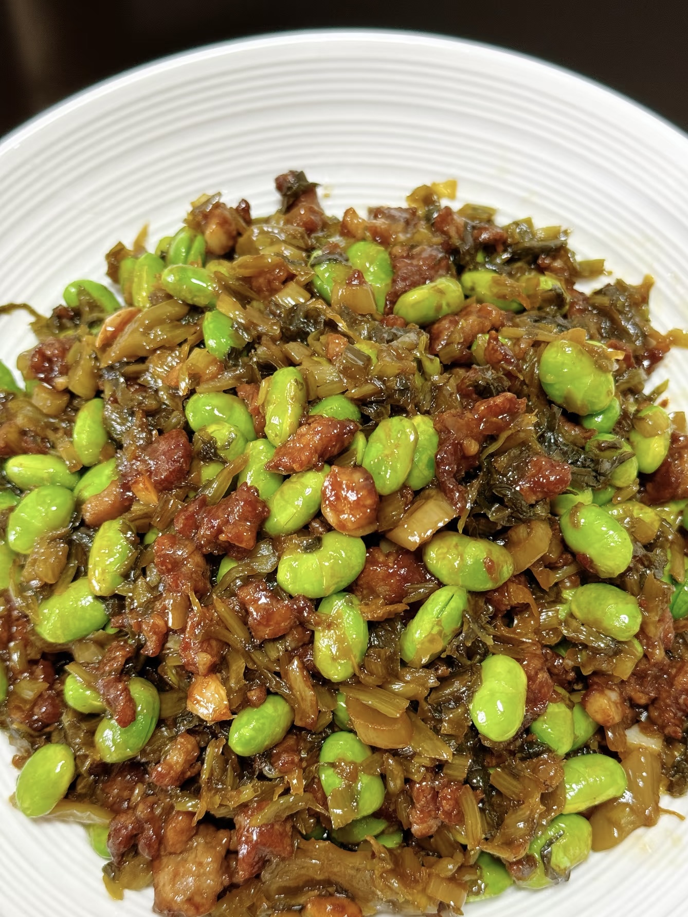成品亮相:毛豆碧绿饱满,像一颗颗“绿宝石”;肉丁棕红油亮,挂着薄薄酱汁;雪菜金黄脆挺,点缀其间。夹一筷子入口,毛豆“噗呲”爆汁,甜里带鲜;肉丁嫩到弹牙,咸香裹舌;雪菜“咔嚓”作响,脆感直击天灵盖,配一口米饭,豆香、肉香、酱香层层递进,饭碗瞬间见底。