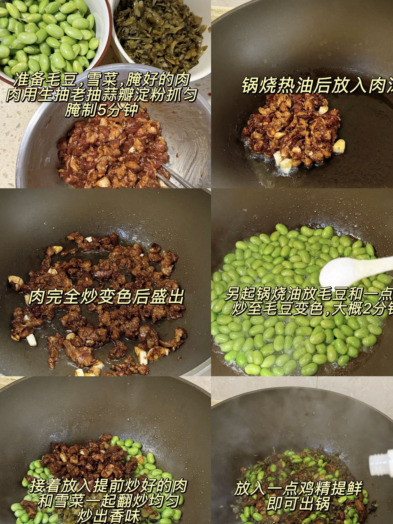 毛豆挑饱满翠绿的“小鲜肉”,现剥现炒,甜度高;雪菜选茎多叶少的“脆版”,咸香足,回家冲水10秒去浮盐,挤干再切小段,既保留咸鲜又避免齁嗓;肉用梅花肉,肥瘦三七开,嫩而不柴,切成指甲盖小丁,大小与毛豆相配,炒出来才“门当户对”。