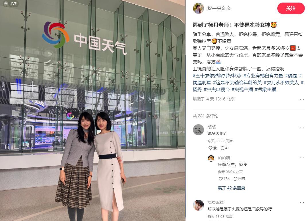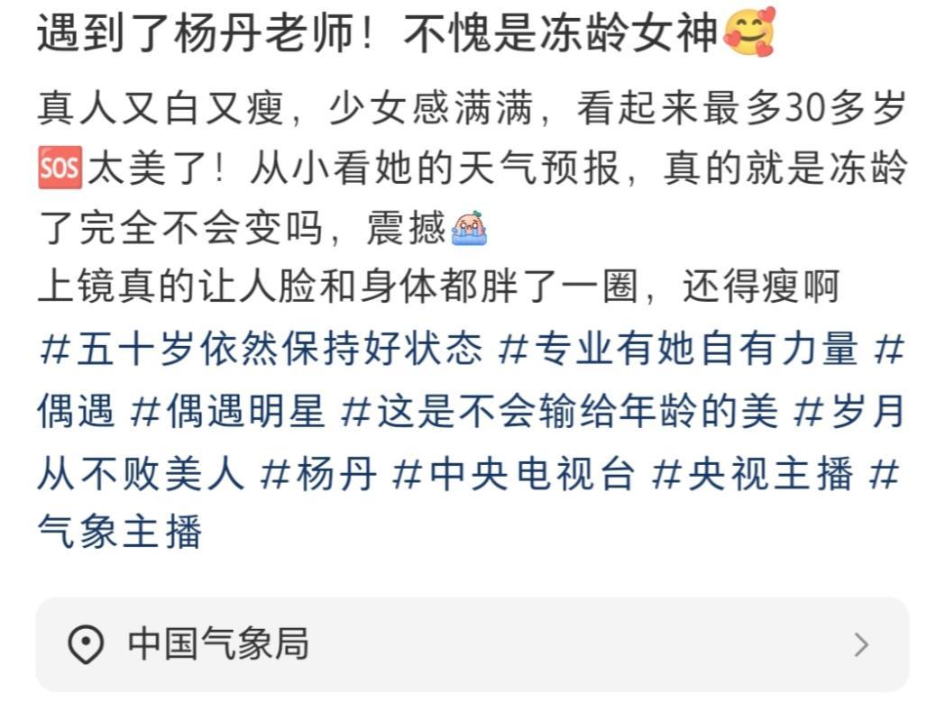 2024年3月4日,北京某商场内,一位素人博主与央视气象主播杨丹的偶遇,在社交媒体掀起蝴蝶效应。照片中49岁的杨丹身着工装风连衣裙,腰线收束得恰到好处,面部紧致度堪比医美广告样本,这条动态24小时内收获百万点赞,评论区挤满"求保养秘籍"的呼声。这场看似普通的偶遇事件,实则折射出数字化时代公众对"冻龄美学"的集体痴迷。