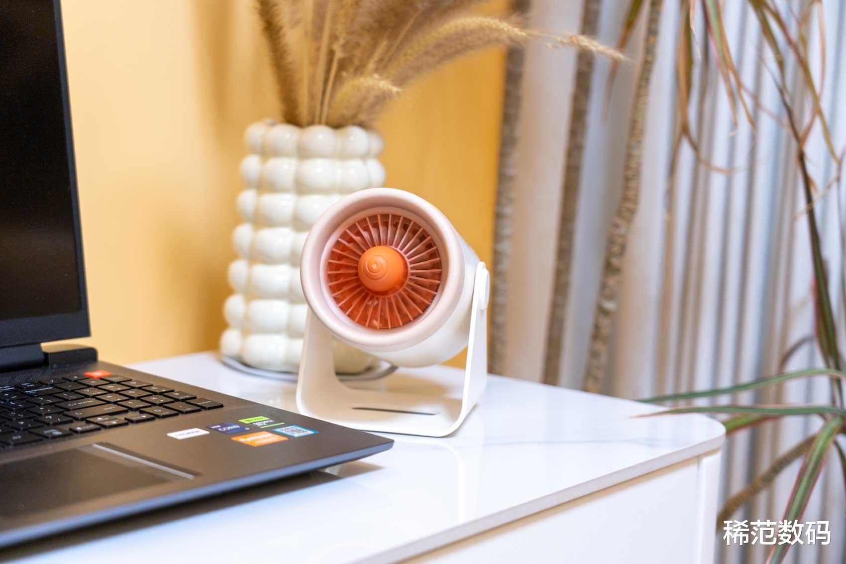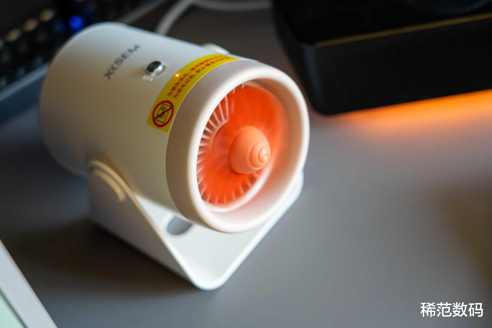 它的尺寸小到我一只手可以抓起来,红红的叶片像飞机的涡扇叶片一样,富有科技美感。一个便携式的底座可以很方便的摆放,并且带有角度可以调角,支持90°仰俯自由调节,我可以根据桌面、卧室或办公场景灵活调节风向,实现立体均匀送暖。这一贴心设计让温暖能够精准覆盖每一个使用角落,带来更舒适、更智能的取暖体验。无论是需要暖脚、暖手还是暖身,都能找到最合适的角度。