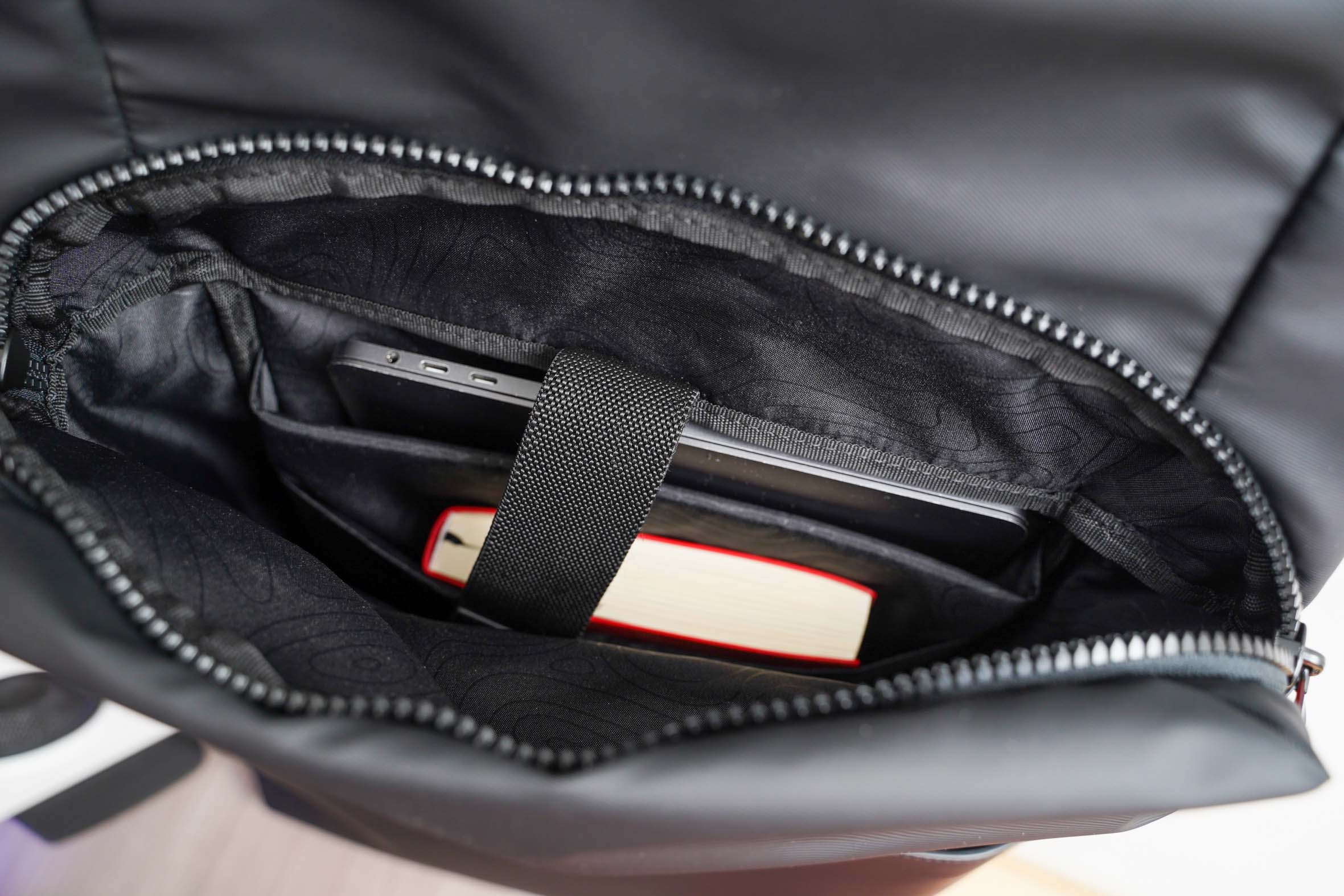 掀开背包的上盖,下方就是一个内有绒布内里的顶袋,墨镜放里面就很合适,毕竟绒面材质不会磨损到镜片,细节设计很用心。