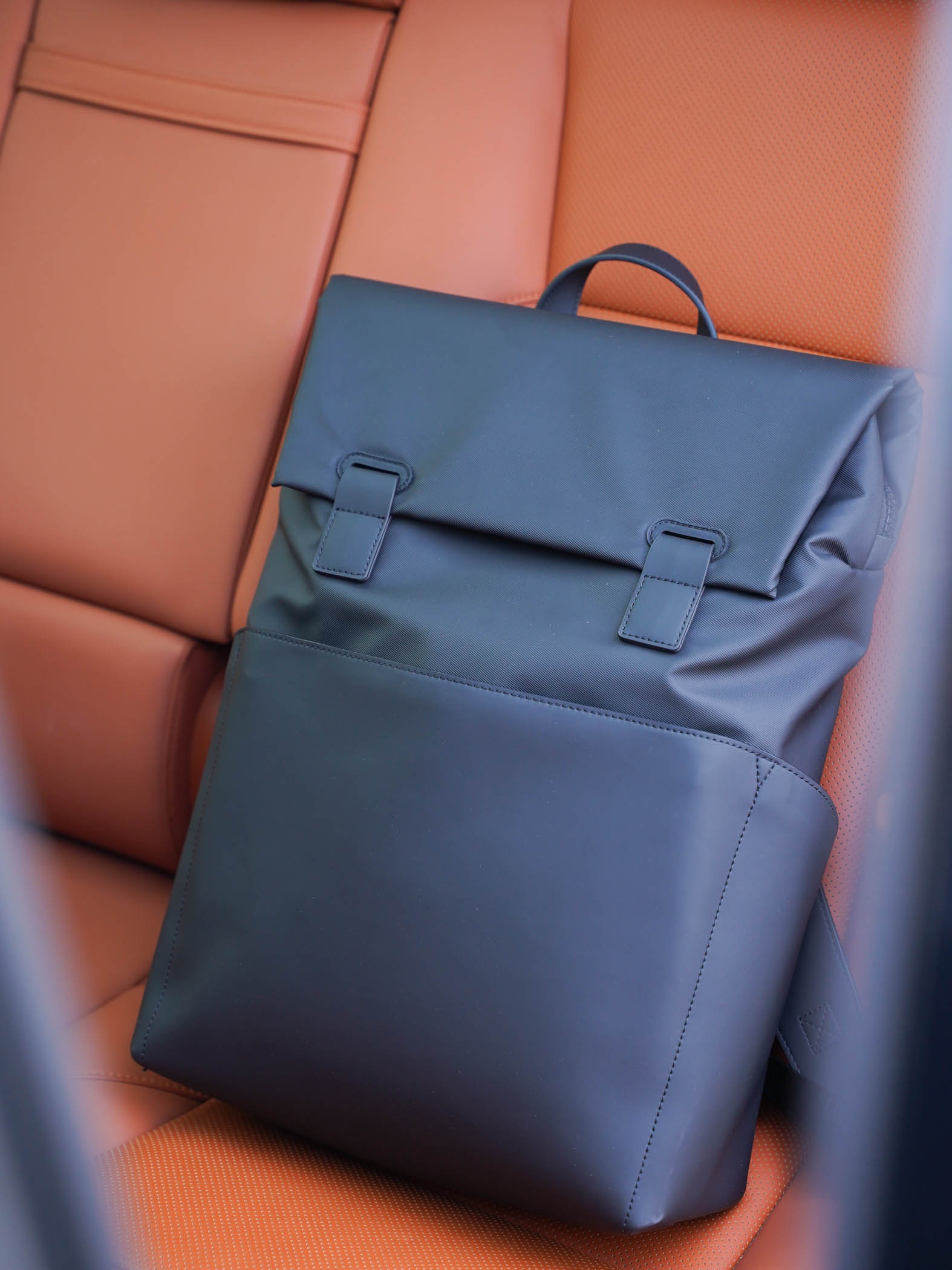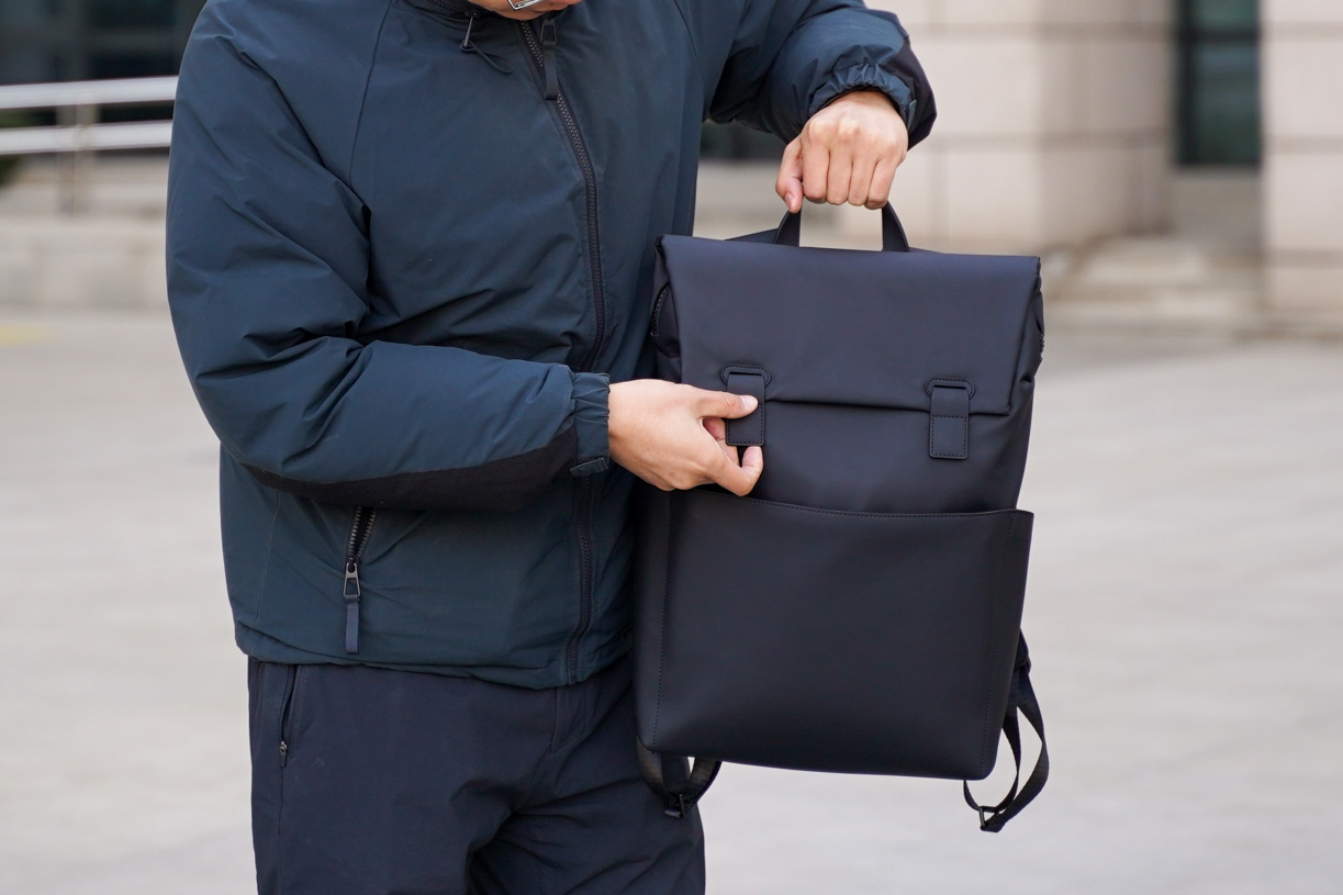 有些时候我们需要手提双肩包,地平线8号也为我们想到了,背包顶部配备了一个圆弧状的皮革提手,提手宽度适中,拎在手上舒服不勒手。磁吸搭扣的设计很巧妙,不只是开启的时候很方便,合上的时候同样很好用,啪嗒一下自动吸上,固定的还挺牢固。