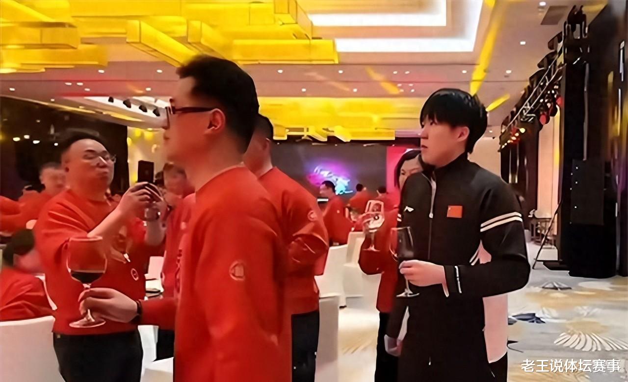 他端着酒杯,在人群中穿梭,那一举一动都充满着一种难以言喻的张力。他就像一只蓄势待发的猎豹,随时准备爆发。 终于,他走到马龙和孙颖莎面前,停下了脚步。 “来,龙哥,莎莎姐,这杯我敬你们!”他语气略显生硬,但眼神里却充满了真诚。