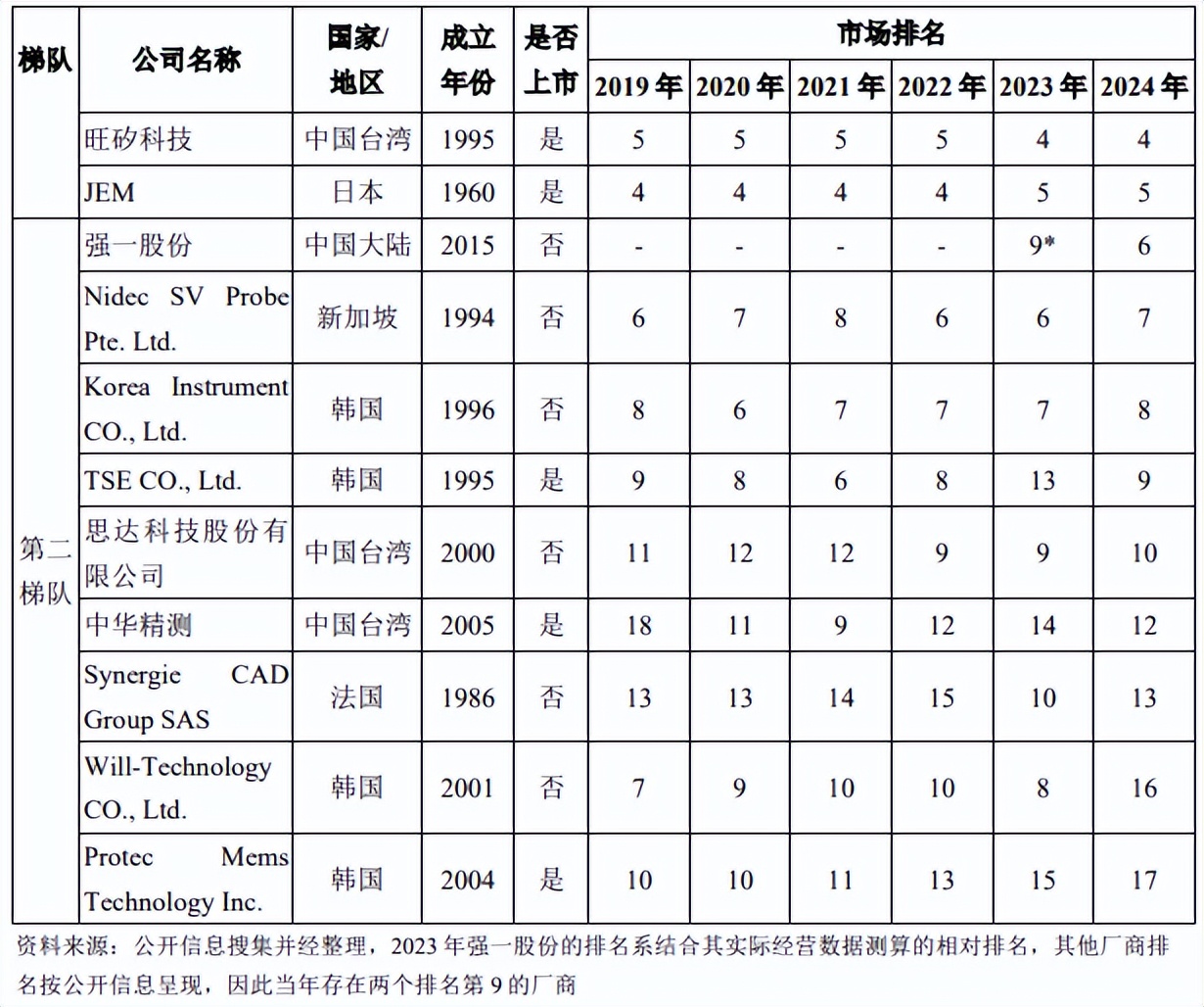 招股书中,将FormFactor、Technoprobe、MJC、旺矽科技、JEM等5家公司,划为全球探针卡行业的第一梯队公司,自2019年来,这5家公司均处于全球市场TOP 5地位,未曾动摇。